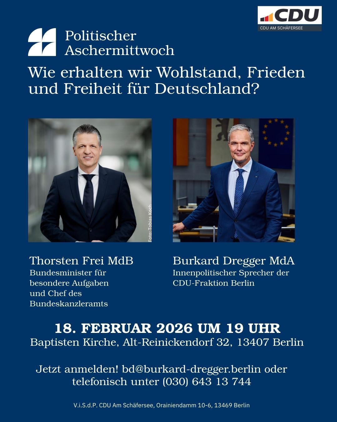 Wir laden Sie herzlich ein zu einem persönlichen Austausch bei Bratwurst und guten Gesprächen. Gemeinsam mit unserem Abgeordneten Burkard Dregger und unserer Bezirksverordneten Klaudyna Droske möchten wir mit Ihnen ins Gespräch kommen – über die Themen, die Ihnen wichtig sind.