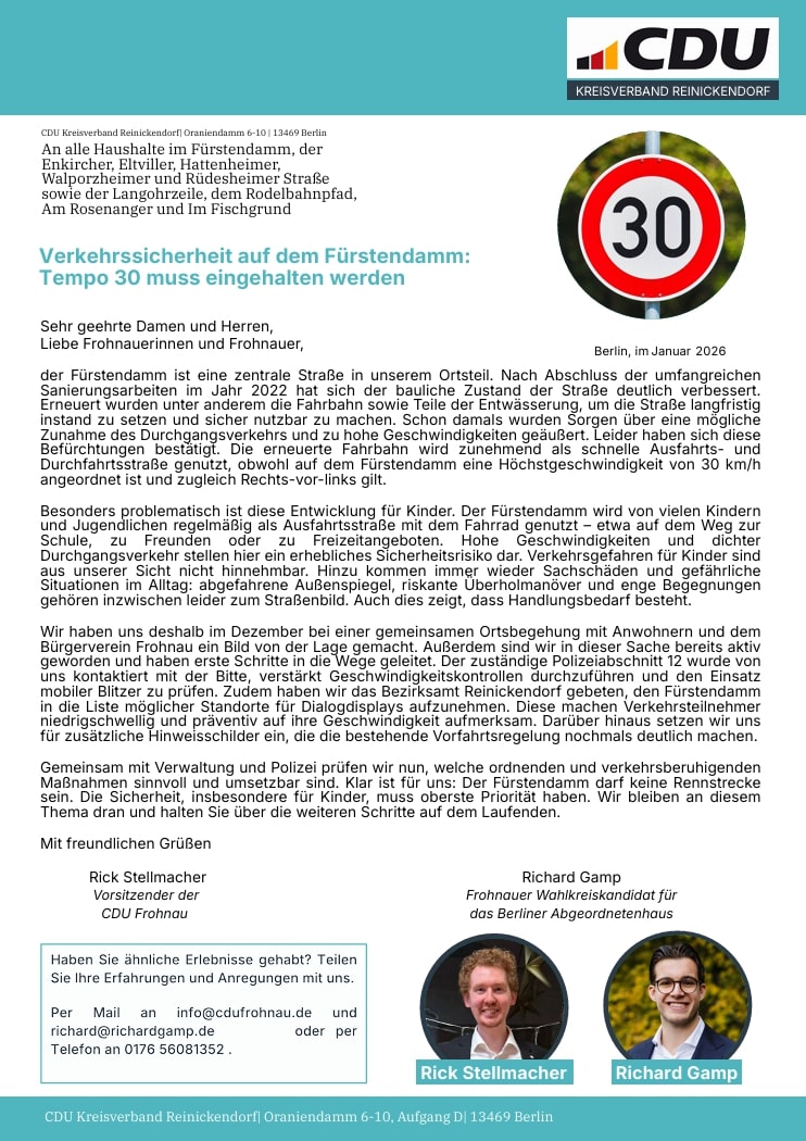 Wir haben uns deshalb im Dezember bei einer gemeinsamen Ortsbegehung mit Anwohnern und dem Bürgerverein Frohnau ein Bild von der Lage gemacht. Außerdem sind wir in dieser Sache bereits aktiv geworden und haben erste Schritte in die Wege geleitet. Der zuständige Polizeiabschnitt 12 wurde von uns kontaktiert mit der Bitte, verstärkt Geschwindigkeitskontrollen durchzuführen und den Einsatz mobiler Blitzer zu prüfen. Zudem haben wir das Bezirksamt Reinickendorf gebeten, den Fürstendamm in die Liste möglicher Standorte für Dialogdisplays aufzunehmen. Diese machen Verkehrsteilnehmer niedrigschwellig und präventiv auf ihre Geschwindigkeit aufmerksam. Darüber hinaus setzen wir uns für zusätzliche Hinweisschilder ein, die die bestehende Vorfahrtsregelung nochmals deutlich machen.