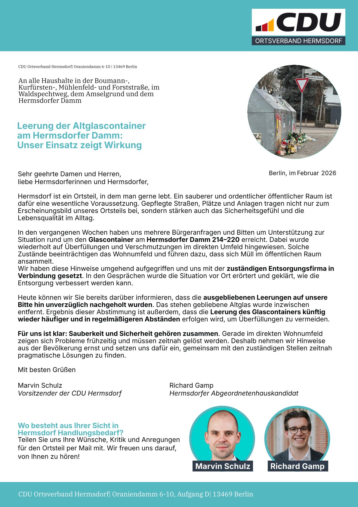 In den vergangenen Wochen haben uns mehrere Bürgeranfragen und Bitten um Unterstützung zur Situation rund um den Glascontainer am Hermsdorfer Damm 214–220 erreicht. Dabei wurde wiederholt auf Überfüllungen und Verschmutzungen im direkten Umfeld hingewiesen. Solche Zustände beeinträchtigen das Wohnumfeld und führen dazu, dass sich Müll im öffentlichen Raum ansammelt.