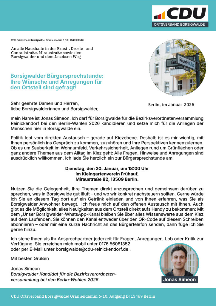 Am Dienstag, den 20. Januar 2026, um 18 Uhr, laden wir herzlich zur Bürgersprechstunde in den Kleingartenverein „Frühauf“ (Miraustraße 82, 13509 Berlin) ein. In entspannter Atmosphäre möchten wir bei einem Getränk mit Ihnen ins Gespräch kommen und stehen für Fragen, Anregungen und Wünsche zur Verfügung. Ganz gleich, ob es um Sauberkeit, Sicherheit, Verkehr oder andere Themen aus dem Kiez geht – Ihre Anliegen sind willkommen. Kommen Sie gerne vorbei – wir freuen uns auf das Gespräch!